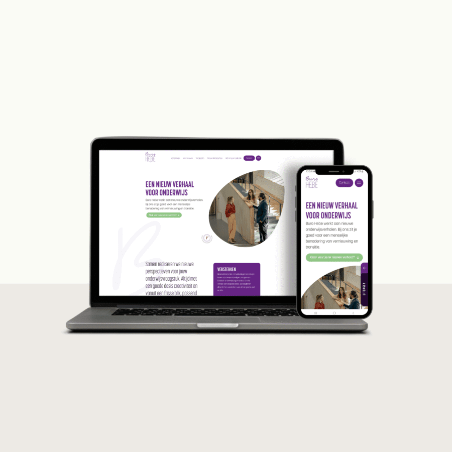 Tot slot ontwikkelden we een nieuwe website waar alles samenkomt: het verhaal, de juiste tone of voice en de nieuwe uitstraling. Ook dit deden we met een partij uit ons netwerk waar we graag mee samenwerken. We startten met een sitemap en wireframes en maakten slimme keuzes in de content en structuur. We schreven duidelijke en mensgerichte teksten, passend bij het doel om mensen en organisaties in het onderwijs in beweging te brengen en samen met hen te werken aan een nieuw verhaal. De website biedt een frisse kijk op onderwijs, met onder andere opinieartikelen en praktische voorbeelden uit de praktijk. Op de site staat de kern centraal: de expertises van Buro Hebe, de unieke aanpak en het verschil dat zij maken in het onderwijs. Geen standaardaanpak, maar altijd maatwerk.